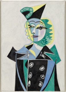 The rest of the Pompidou display sensibly discourages close comparisons and sets us on a treasure hunt instead. There are thirteen ensembles displayed around the gallery; not knowing where the next one will be found or how it will be shown is most of the fun, though perhaps not very fair to the art. A Braque-inspired cape (Spring/Summer 1988) gets a prime spot among the Cubist paintings, but the embroidery on its back means the bust is turned away from the viewer, just a hint of neck inclining towards the wall. The most successful moments occur when an outfit is allowed to command the space or comment on its neighbours. A short orange appliqué dress that nods to Picasso’s costumes for Parade makes the surrounding Sonia and Robert Delaunays seem ponderous; it’s hung on a plinth in the centre of the room, so that visitors have to walk around it – an imposing display for a dress that could never be commanding in the wild. Another homage to Picasso, a long-sleeved satin evening dress quartered in black and white, stands to the side of Harlequin and Woman with a Necklace (1917). While the subjects of the painting tilt jauntily to the right, the solitary dress stands primly to attention. On an adjacent wall, only the tricorn hat and right shoulder of Picasso’s deliberately unfinished Harlequin (1923) have been painted in; the rest of his clothes are left outlined and cross-hatched. This Harlequin seems to know that he will never get fully dressed.