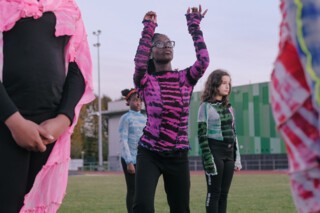 Writing about Radio Ballads in 1981, Ewan MacColl described the recordings of people and locations as ‘actuality’. The term is particular to radio, and perhaps to a certain era of radio, but it’s useful here too. For MacColl and his colleagues, the recorded voices were the raw material for songs; they were also what told the audience that what they were hearing was real. Radio detaches the voice from the body, but as listeners we form an idea of a person, the person has a body that produces a voice, and the voice represents, at least to some extent, who they are. We can then decide who they are in relation to us: a contract that asks to be disrupted in art. This is what Sonia Boyce attempts in Yes, I Hear You, in which interviews with domestic abuse survivors are played over a short four-channel film. A group of performers interprets the transcripts. Unlike, say, Clio Barnard’s film The Arbor (2010), in which actors lip-sync to recordings of interview subjects, these interpretations are not re-voicings but something looser and more open-ended, closer to dance, choreographed and arranged to a great extent by Boyce’s fluid editing. We see hands pulling on a pair of protective gloves – signifying collaborative work in a pandemic – as we hear a woman’s voice on the phone to the police; she needs to get a violent man out of her house. The performers sit in a circle and move around a black box theatre. They dance, clasp hands, stand still and smile to camera. Each is wearing a body-mounted camera, too, supplying exaggerated perspectives of laps, legs and hands. The accounts of abuse, read by actors to detach them from their original speakers, become distributed among the group, which functions as a kind of collective respondent.