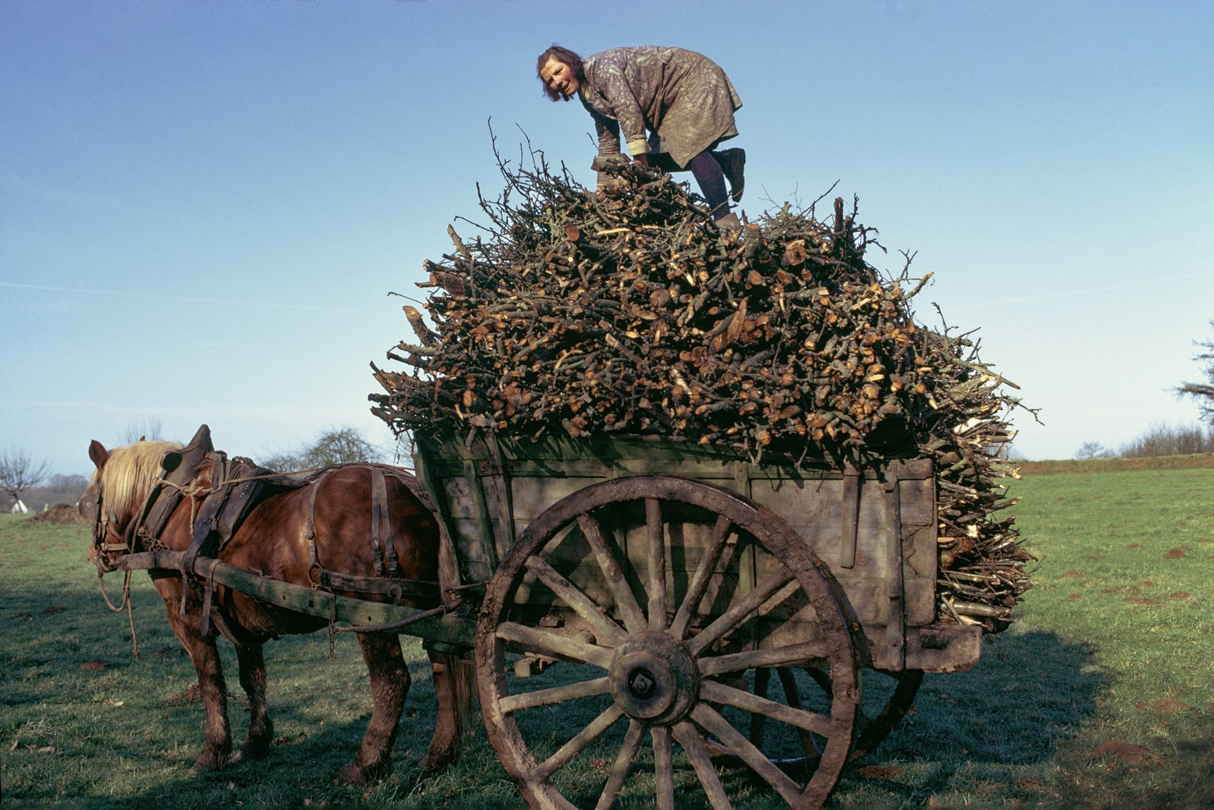 In January 1975, Sinéty is helping Mme Denoual collect the valuable remains of the hedgerows that Denoual père has already sorted and bundled. A mountain of wood towers above the sideboards of the cart; Mme Denoual takes the reins and their mare begins the long haul back to the homestead. Sinéty records that she and M. Denoual return down a tarmac road on foot – ‘or rather, in clogs’, which she is still learning to master. As one foot goes forward and the clog falls, a clack in the wintry air announces that the loose clog on her other foot is about to drop and fasten her to the road: she is learning a step at a time. Later, at lunch, M. Denoual reads the local paper and his daughter takes Sinéty down to the cellar, armed with a jug, where they suck on a rubber tube at the head of a barrel until the cider flows. Among Sinéty’s best shots are one of a woman crouching on a cartload of wood as a mare stands patiently between the shafts, and another of a man in a beret in a sombre interior reading a broadsheet newspaper.