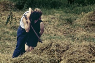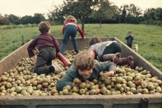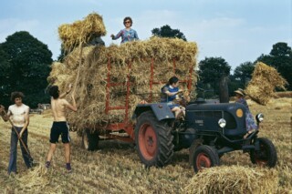 The prints in Un Village suggest that Sinéty was eager to be part of the network of social relations she discovered in Poilley, the manners and protocols of village life, its rhythms of labour and repose. In the end, this wish to be fully subsumed into her material made her an insider, but only a few of her portraits, most of them shot indoors, propose the illusion of intimacy. For the children, swimming in a stream or rolling in a cart full of apples, leisure activities are often the result of a fleeting opportunity, hurriedly seized. For the adults they’re a more formal affair, with feasts and dances dictated by the calendar or a seasonal change in the patterns of work. Out in the meadows or in the barns, Sinéty is deeply engaged with labour and livelihood, allowing work itself to take centre stage, even though she has a sharp eye for distinctions among the labourers. In one shot of haymaking, a young man in shorts and another in flared jeans load bales onto a trailer hitched to a state-of-the art tractor while a woman in a patterned dress and sunglasses sets them in order. In the next shot, two older women and a man are heaving tedded hay onto their cart with pitchforks; their tractor is a crock.