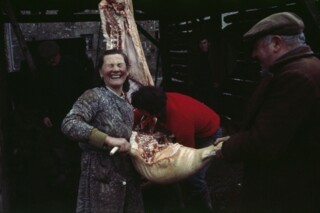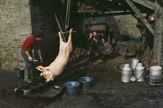 The commune of Poilley in Brittany is fifteen minutes by car from the coast, but in Madeleine de Sinéty’s photographs we imagine a village miles from a beach or a harbour and further still from Rennes, the regional capital. Sinéty discovered Poilley by chance in the early 1970s. She had been on holiday, and heading to Paris, where she worked as a magazine illustrator – for Marie-Claire, among others. She took the backroads to avoid the traffic and stopped for the night in an obscure village. The following morning, she got her bike down from the car and toured the neighbourhood. She was eyed with suspicion by a five-year-old girl walking with her grandmother, who later befriended Sinéty and became godmother to her son. By then Sinéty was spending most of her time in Poilley, building a photographic record of its inhabitants, their animals (dead or alive), and the routines (daily or seasonal) that structured village life. In the early 1980s she left for the US and the project came to an end. She died some years later, leaving more than thirty thousand colour transparencies and twenty thousand black and white negatives of scenes shot in and around the village.