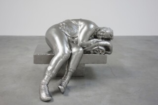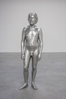 Alongside stainless steel, concrete and paper are currently his preferred media. Respectively ponderous and fragile, both concrete and paper reinforce the degree to which the steel sculptures – Shoe Tie and Sleeping Woman (both 2012), for example, or Horse and Rider (2014) – revel in effects owed to their medium, including its transfixing capacity to shine. Look again at Young Man. The surface finish converts the body’s curves (across the buttocks, for example, or under the arms) into a familiar type, despite or perhaps because of his nudity: a well-fed figure of the corporate office, the golf course, the air-conditioned mall – a little plump, a little lazy. In this context, shininess seems peculiarly American, an effect that carries negative, maybe even dangerous, connotations. At times it looks pristine, and therefore chilling, while elsewhere it looks like bling. There is a counter-movement in Ray, which means that shine is varied, even individually inflected, to amplify our sense of the subject: in other words, shine can help to characterise exactly who or what is portrayed. His characters have mastered their parts.