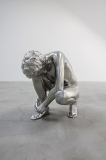 In 2015 Ray created Silver, a life-size silver sculpture of a German Shepherd. Why this material instead of stainless steel? One reason – and I say this tentatively – may be that the softer glow of silver suggests something more noble, more ancient, than the steel Ray uses for human animals. If so, this is further support for the notion that shine can express something of the subject’s character. Yet in other instances, it lets the surrounding world into the sculpture, inflecting the body it shows. Shining and mirroring, in other words, can sometimes be the same thing. A photograph taken in Ray’s studio captures a bright red reflection in the curls of Reclining Woman (2018), his most voluptuous work. The effect was accidental, which was exactly what Ray intended. His stainless-steel works love the light. And so much the better if in the process a lipstick-red reflection briefly enhances the eroticism of the female nude.