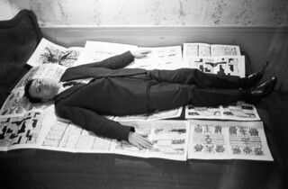 After the war, Isou became a peripheral member of the literary scene in Bucharest, where his ambition to become a writer found its first serious expression. In 1944, he founded a journal, Generation 944; its name a promise of change (he and his collaborators had flirted with Da, or ‘Yes’, a nod to Dada). No copies survive, but Isou’s notes show that it was here that lettrisme was first defined, if you can call it a definition: ‘Nu e Dada/E Bada!’ – ‘This is not Dada, it is Bada!’, where Bada means ‘Yes, of course’ in Romanian slang. In the same notes, Isou declared that lettrisme developed the work of James Joyce, and that, like Joyce, he would be ‘MARE OM DIN LUME’ – ‘A GREAT MAN IN THE WORLD’. He also wrote for Mântuirea, a Zionist weekly, addressing a wide range of subjects: Surrealist painting, Stalin (with whom he identified) and the reasons Jews disliked snow. He had a knack for getting into the right circles and for falling out with everyone around him. His superiors thought him a ‘little shit’. There was a lot of talk among colleagues about migrating to Palestine; Isou attempted the dangerous journey and failed. He was unperturbed. His mother had often told him that ‘Isidor’ meant ‘Israel’ in Hebrew, so his people were certain to follow him wherever he went. Paris would be the new Jerusalem, French the new universal language. When a fellow Zionist criticised his decision to go to France instead of Israel, Isou said: ‘I’m declaring myself to be the ambassador of the Jewish people on earth. Why shouldn’t I be Joan of Arc for the Yids?’ And so, with forged papers and manuscripts in hand, he made his way to Hungary, Austria, Italy and finally to Paris.
