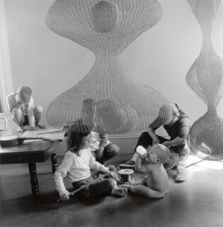 Asawa and Lanier decided to settle in San Francisco in 1949 after hearing that you could get a five-course Italian meal in North Beach for 75 cents (this turned out not to be true). Albert got a job with an architecture firm, and they had six children in nine years – Xavier, Aiko, Hudson, Adam, Addie and Paul. Asawa found a way to work alongside them, as the photographer Imogen Cunningham illustrated in a series of portraits. The two women had been introduced by Cunningham’s son, Rondall, in 1950, and remained friends and collaborators until her death in 1976. In an image from 1957, Cunningham shows Asawa absorbed in her work while her children play around her – one of her sons crouches on a table, his head down in studious imitation of his mother, while two older children sit on the floor beside her. A naked baby feeds from a bottle of milk. Partly obscuring the family scene are two looming sculptures.