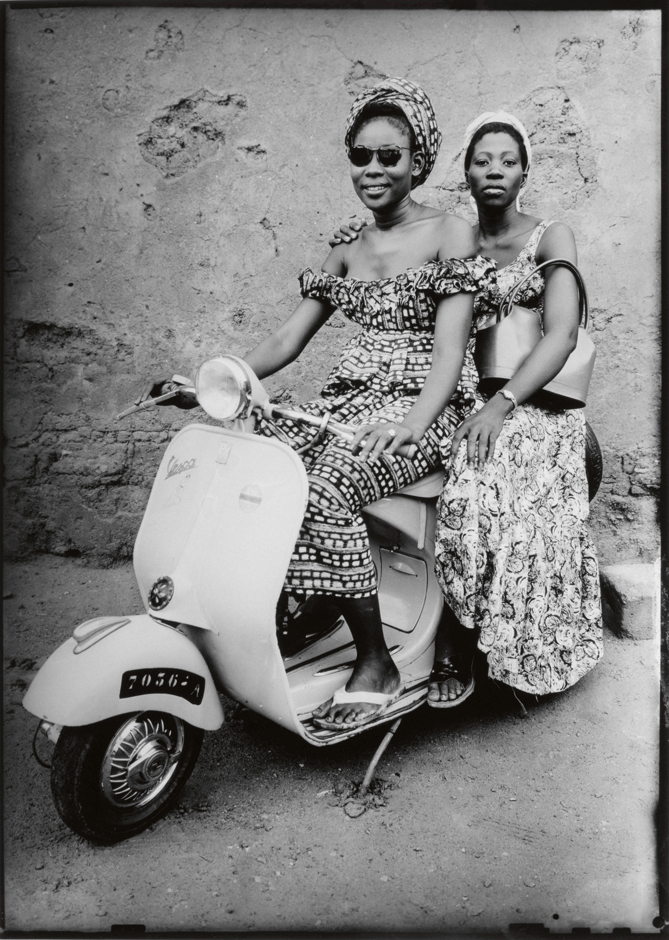 How does the ordinary African conceive of their style? How do they dress? The closest the show comes to answering this is the section devoted to the studio photography of Hamidou Maiga, Rachidi Bissiriou, Sanlé Sory and Seydou Keïta. In one photograph (by Keïta), we see a dandyish young man with a shaved head, large square black glasses and a smart white suit. He is holding a flower and half smiling. It’s a tragi-comic romantic image: is he dressed up for a particular person, or is this self-fashioning a case of art for art’s sake? In another black and white photograph, two women ride a scooter in printed dresses, one wearing sunglasses and one without; elsewhere, a man with black bell-bottoms, a black turtleneck and blazer carries a guitar slung across his shoulder. These pictures suggest a before and after: the subjects are on their way somewhere. Their clothes tell us something about trends – which continued to be imported as well as self-generated – but also about social life, identity, money. Fashion here is part of everyday life.