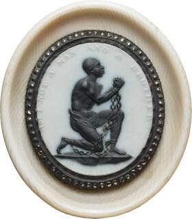 While the revolutionary rattlesnake was hidden from public view, Wedgwood’s abolitionist medallion became one of the defining images of the campaign to end slavery and is still one of the best known. It shows a kneeling Black man in shackles, naked except for a loincloth, raising his hands and eyes upwards in a gesture of supplication. Inscribed around the upper curve of the medallion is his question to an implicitly white viewer: ‘Am I Not a Man and a Brother?’ Based on the seal for the Society for Effecting the Abolition of the Slave Trade, on whose committee Wedgwood served, the medallion was widely distributed among members and sympathisers. Benjamin Franklin believed it would have a persuasive power equal to that of ‘the best written Pamphlet’. Thanks to its small size, it became a style statement, inset into jewellery, hair pins, shoe buckles and snuffboxes. According to the abolitionist Thomas Clarkson, it represented a moment when ‘fashion, which usually confines itself to worthless things, was seen for once in the honourable office of promoting the cause of justice, humanity and freedom.’