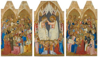 When an enormous 14th-century polyptych made for the Florentine church of San Pier Maggiore was bought by the National Gallery in 1857, the director, Charles Eastlake, didn’t really know what to do with it. The altarpiece, painted by Jacopo di Cione and his workshop in the early 1370s, is one of the biggest made in the 14th century and, even though it had been dismantled after the church was destroyed in the 18th century, all twelve of the main panels entered the collection (only the bottom predella register and the pilaster panels were missing). The 1857-58 acquisition report reveals that Eastlake had wanted these gold-ground panels as ‘specimens’ of the origins from which ‘Italian art slowly advanced’; less as artworks in their own right, and more as foils to the work made later in the Renaissance. Gallery space was already tight, however, and this twelve-part ‘specimen’ was going to take up a lot of it. The panels therefore remained separate, some going into storage while others were slotted into the chronology on the gallery’s walls. At the end of the century, the three-panel bottom tier – showing Christ crowning the Virgin, flanked by crowds of adoring saints – ended up on the landing outside the galleries proper, squeezed between doors and columns. Visitors might have caught a glimpse of it on their way into the great hall.
