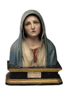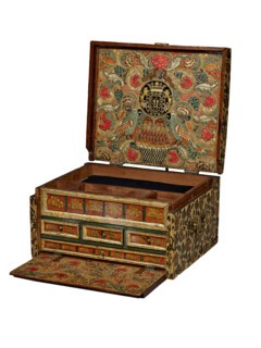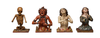 Works from the New World include luxury goods made using local materials and motifs, and often produced in response to ceramics, textiles and lacquerware imported from Asia. The finish of a beautiful barniz de Pasto portable writing desk (c.1684) is resin from the Colombian Mopa-Mopa tree applied onto painted peonies, carnations, parrots and monkeys. Nicolás de Correa’s Wedding at Cana (1696) is an example of the enconchado technique inspired by Japanese Namban. The background, faces and food and drink on the tables are painted in oil, but the shimmering garments are inlaid mother of pearl. Several sculptures in the European technique of polychromed wood depict subjects unique to the Spanish colonies. The Four Fates of Man: Death; Soul in Hell; Soul in Purgatory; Soul in Heaven (c.1775), attributed to the Ecuadorian Manuel Chili, was probably intended for a devotional setting, but – as the only work of its kind – is difficult to contextualise. The vividly coloured half-length figures represent the possible trajectory of the soul, with the agonised scream of the damned and glass tears of the figure in Purgatory warning us that neither would be a great place to end up.