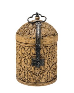 In the first rooms, dedicated to the ancient world and Al-Andalus, Celt-Iberian silver bracelets sit alongside Roman trullae and a Visigothic copper alloy, garnet, glass and cuttlefish bone belt buckle. The Córdoban Pyxis (c.966) is one of about 35 ivories carved in workshops at the palace city of Madinat Al-Zhara for the caliph’s close family and associates. An inscription tells us the name of the carver, Khalaf, and offers us an ekphrastic poem comparing the object’s beauty to the breast of a young woman. Also from Islamic Spain are two silk textiles, one of them with a central band featuring scenes of women drinking and addorsed gazelles. Although figurative imagery wasn’t condoned in devotional contexts, these silks were often given as gifts or purchased by well-to-do Christians. Lustreware vessels, around a dozen of which are on display, were also prized by Christian patrons, not only in Spain but in Italy too. The tin-glazed earthenware baptismal font from Toledo (c.1400) represents the Mudéjar style that emerged after the so-called Reconquista, as Christians and Jews emulated the sophisticated culture of the courts of Al-Andalus. Its decorative scheme alternates the cross of Golgotha and IHS monogram with the khamsa or ‘Hand of Fatima’.