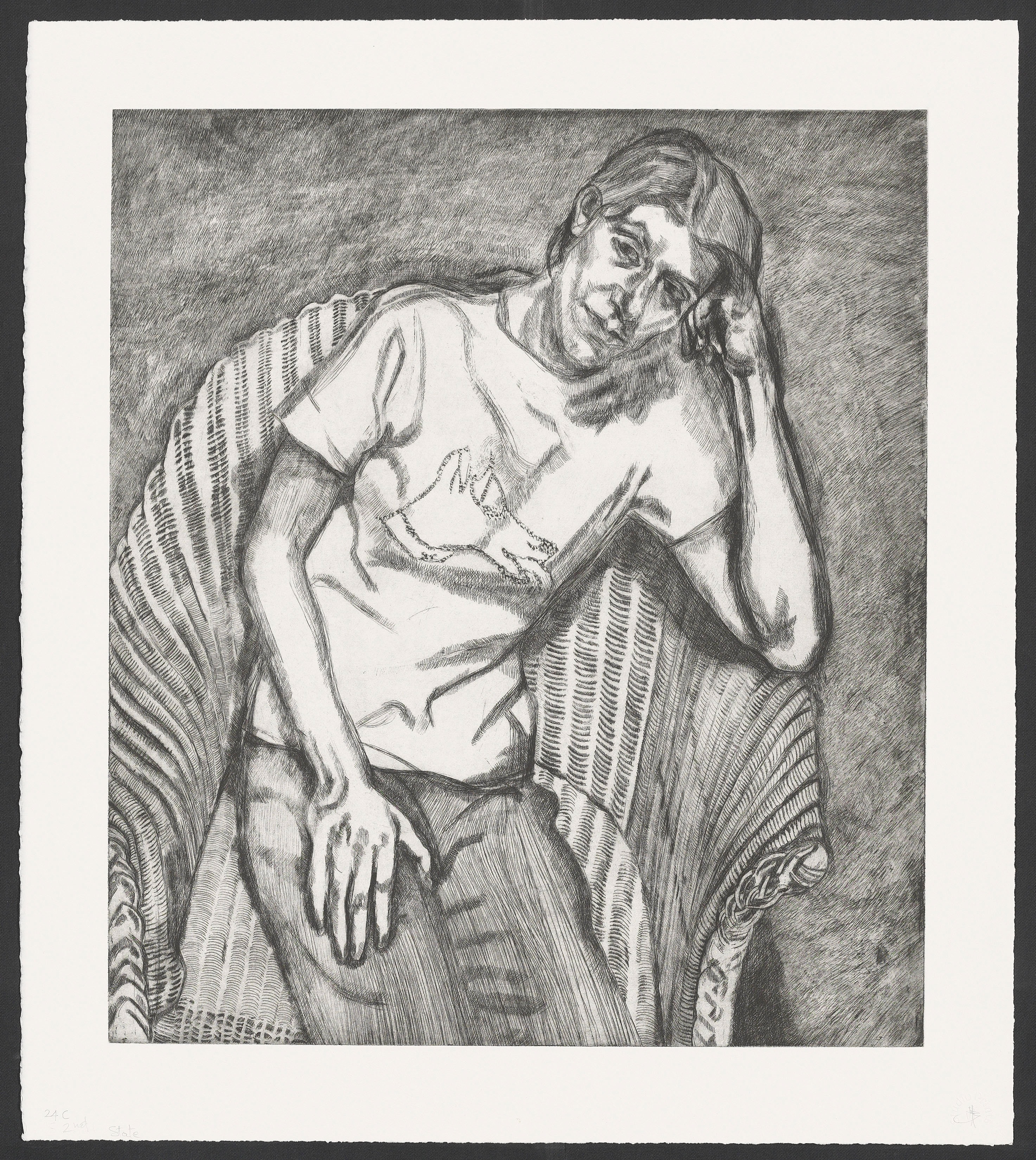 At the time, Freud was making precise line drawings in pencil, conté or ink. His conté drawing of Lorna Wishart in an ocelot coat, his ink drawings of a dead monkey and of sea holly (all 1944) and more obviously his self-portrait in ink, Man at Night, from 1947, all suggest that a transition to hard-ground etching would have been logical. The minute dots with which he composed the shading in his ink portraits, and his almost fetishistic way with fine strands of hair, would have lent themselves to drawing with a needle. For a short while, that seems to have been the case. He made six etchings between 1946 and 1948, half of which – all portraits of Kitty Garman – were in this vein. His Girl with Fig Leaf, etched in Aix in 1947 using tools given to him by Graham Sutherland, is a close relation of his paintings and drawings of Garman at the time. Among the best-known of these are his strange strangling sitter Girl with a Kitten (1947, in oil) and the petrified-looking Girl with Leaves (1948, conté and pastel).