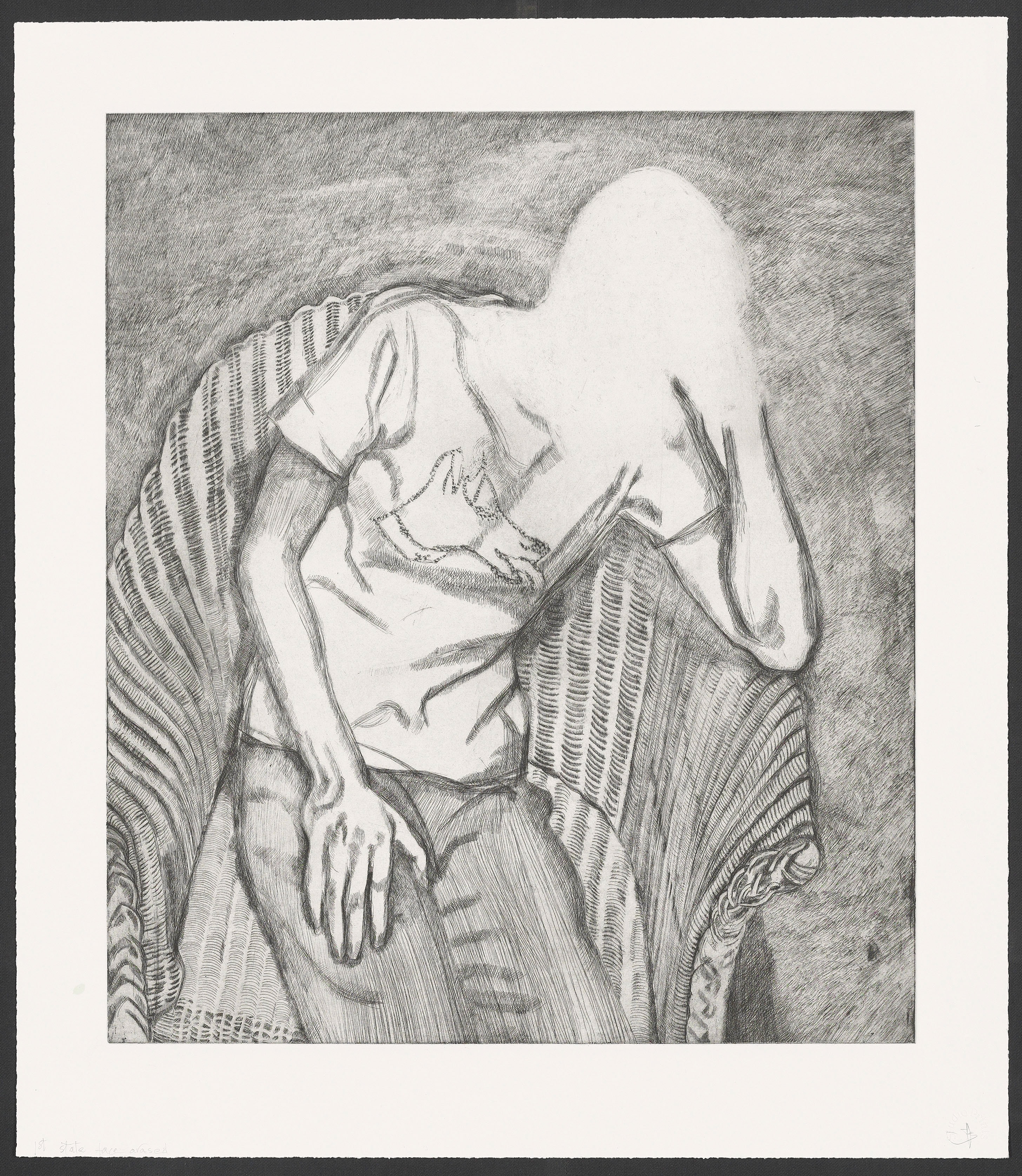 Perhaps the most dramatic, and most intriguing, revisions are those that offer evidence of a struggle. In particular Freud seems to have grappled with the top of Leigh Bowery’s skull in 1994 – Balakjian erased and proofed it in five permutations – and with the head of his daughter Bella in 1995. In the case of the latter, we see her face in three distinct variants, alongside two proofs with her head erased. Freud drew and painted Bella often; for this particular print she sat three times a week. In each of the three states she looks like a different person, and the size of her head relative to the rest of her body shifts too. It feels like something of a revelation to be let in on Freud’s difficulty and persistence.