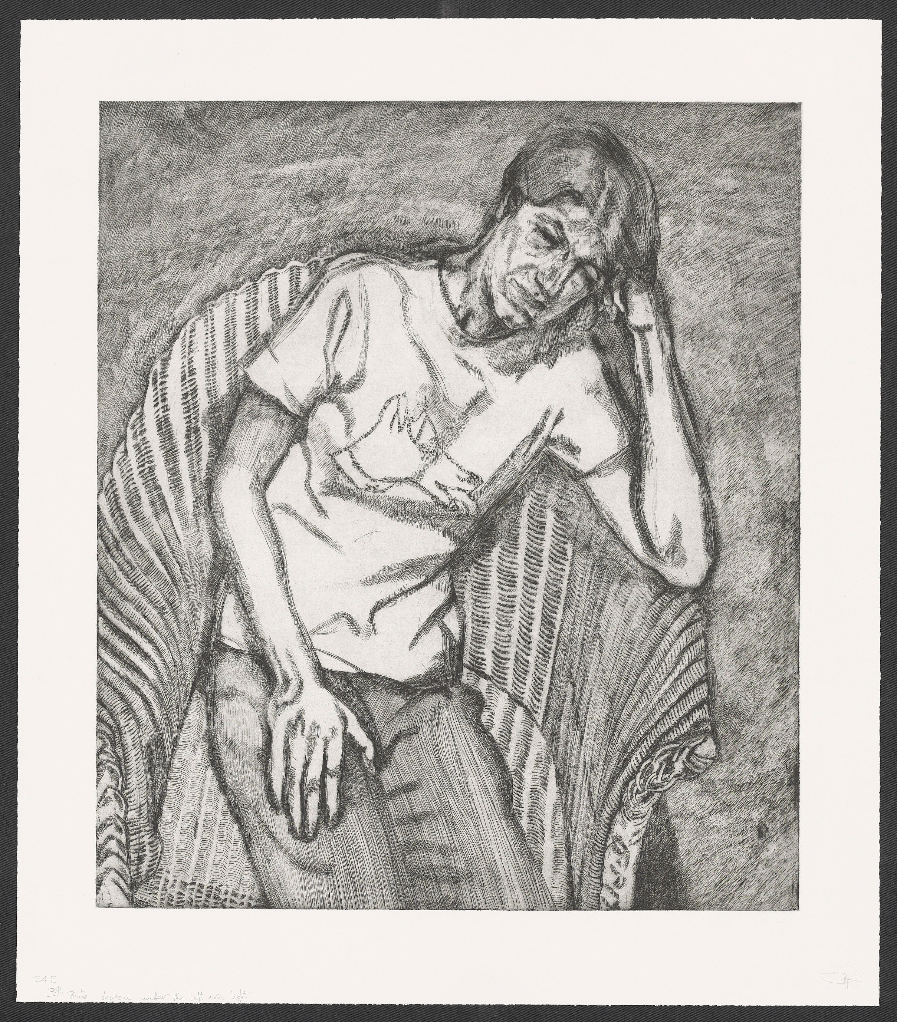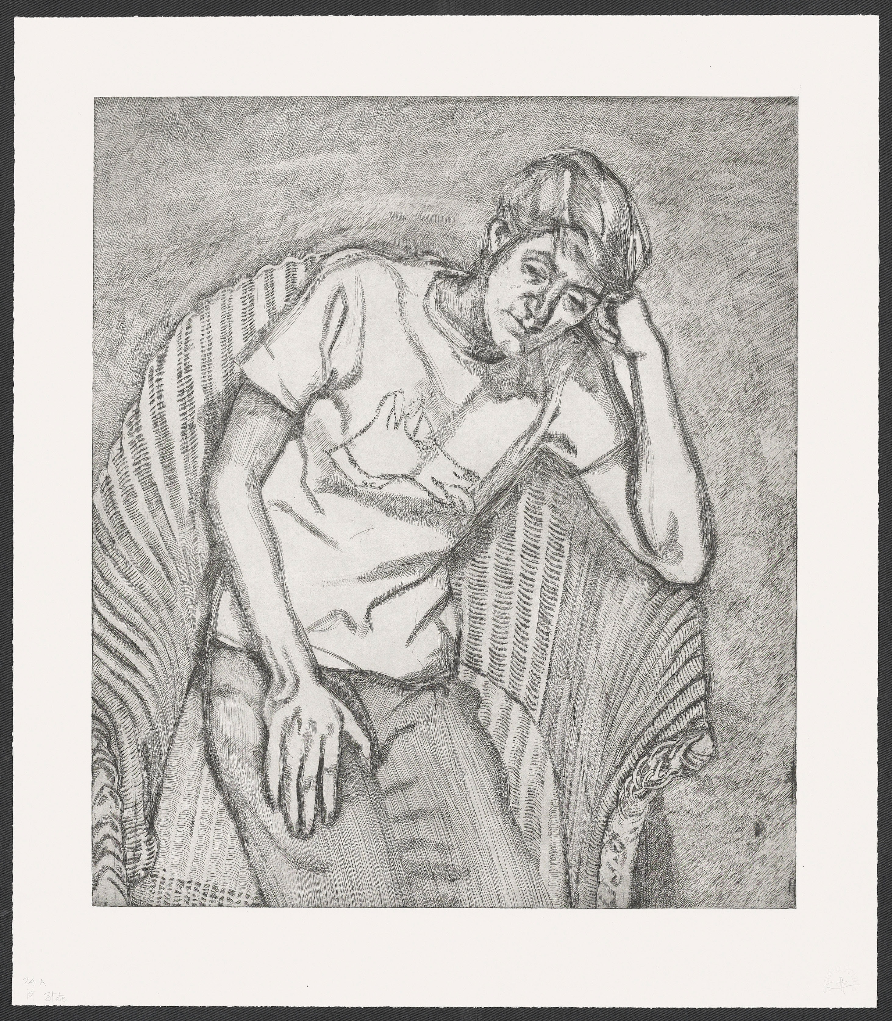 Over time, Freud’s plates got bigger, partly out of ambition and partly out of what he described to Figura as a ‘contrarian’s reaction’ to the miniaturisation and charm of traditional etching. ‘I’ve become increasingly ambitious with age,’ he told Bowery. ‘It’s a fascination with the difficulties.’ Woman with an Arm Tattoo (1996), his close-up portrait of Tilley asleep, is a dense and perverse piece of work. The patterns that detail the forms in her forearm are almost surgical, and her nose, crushed into her palm as she rests, looks painfully contorted. The print features, in Figura’s words, ‘some of the most complex and imaginative markings of all of Freud’s oeuvre’.