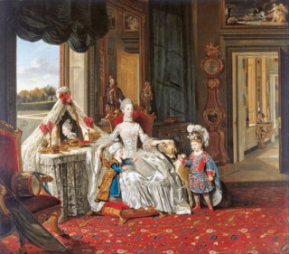 Zoffany’s portrait is a conversation piece (if toddlers can be said to make conversation), which purports to depict a private and natural familial scene, albeit one of public significance. Here, the dressing table is not a symbol of female vanity and artificiality (as it was for Hogarth or Swift) but denotes both royal splendour and orderliness, an attention to proper appearances. In the family grouping, Charlotte is a doting mother, but her reflection in the mirror on the dressing table is a disembodied profile, the reified image of a queen. She is surrounded by the riches of the world, from the Flemish lace on her dressing table to the Turkish carpet beneath her feet, the lacquered Chinese figurines in the background and even the imported flamingo on the English lawn in the garden outside. The power of the British Empire and the security of its future are here represented in the form of a family portrait, with the dutiful queen at its centre in a dress of spotless purity.