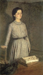 In the end, the two friends travelled only as far as Toulouse, where they spent the winter and John painted Dorelia’s portrait at least twice. The second of these, given the name L’Étudiante, shows Dorelia standing by a desk, leaning against the chair, looking down at her books. She carries another, smaller book in her hand. There is no window, but the strong glow from the lower right-hand side tells us it is evening. There is a lamp or candle just out of sight; it lights Dorelia’s slightly flushed face and casts a large shadow on the wall behind her. Again, John pays attention to posture and costume – the black shawl on the table, the black ribbon around the waist.
