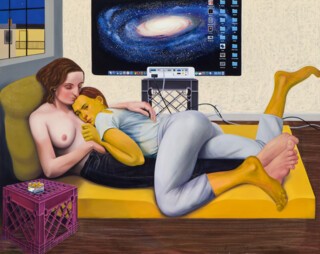 The suggestion of Guston is intriguing. He also began by painting murals, and was in later years fully open to the strangeness and perversion of life. Guston is the direct model for Eisenman’s painting Selfie (2014), in which a large rounded face stares up at a phone screen, reflecting back the protagonist’s single eye. Her 2011 painting Breakup shows a face lost in a screen that once gave pleasure but now is a source of pain. Eisenman captures the anti-aesthetic of screened images, the black hole of gruesomeness they figure in our daily lives. Morning Studio (2016) shows a semi-naked artist lying with her lover on a mattress, the place where an easel would stand occupied by an iMac projecting the Andromeda galaxy screen saver. We scan the desktop for some clue to the artist’s personal life – the top-right folder is labelled ‘Secret Journal’ – but this remains a private realm. Outside the studio window disasters continue to accumulate. Only painting, Eisenman seems to say, can stop the inexorable descent of things: where else can we encounter both rotten life and its utopian counterpoint?
