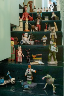 Writing about Vriesendorp has tended to focus on her role as a collector of postcards, souvenirs and various other forms of tourist tat, from metal toys and plastic models to knitted dolls and trinkets. A group of such doodads fills the blocked-off staircase, an ersatz response to Jencks’s collection of Chinese scholar’s rocks, which are placed out of view on the inaccessible top flight of stairs and only visible in a mirror.