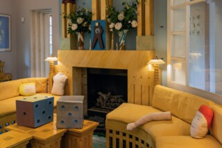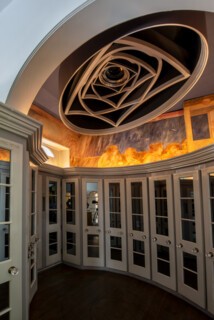 The entrance was originally via the Cosmic Oval, a circular hallway synthesising the key themes of the house. Visitors now enter through the temporary exhibition space in the basement. The ground floor includes rooms named for each of the seasons as well as an Egyptian Room and an Indian Summer Kitchen. There is a Cosmic Loo. The house is part amusement park, part health-and-safety hazard. Steps lead up and down into sunken rooms and annexed spaces. Doubles abound: two doorknobs, two sinks, two toilet flushes (a postcard of a pointing finger alerts you to the right one). Helpful staff redirected me this way and that, across the green-carpeted spaces, and reminded me to watch my step on the cantilevered stone Solar Stair that rises through the centre of the house in a light-filled spiral.