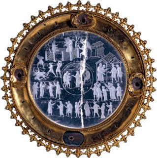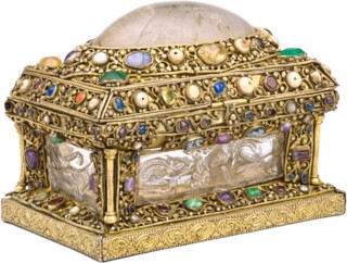 More spectacular still is the Lothair Crystal, named after the Frankish king who ordered it, possibly in Reims in the ninth century. It’s an idiosyncratic work, on a par with the best manuscripts of the period – the equivalent, say, of the Utrecht Psalter. Scenes from the story of Susannah and the Elders are painstakingly engraved into the crystal surface in expressive and minute detail, each image topped by a millimetre-sized inscription in Latin to identify the story. Its gilded silver frame dates from the 15th century; unlike many of the earlier carvings in the exhibition, the Lothair Crystal remained in use for the best part of a millennium, perhaps remounted to a precious reliquary or fixed into a royal throne. What exactly it was used for when it was first produced remains unclear.