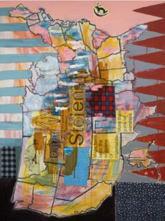 Whiteness, seen from a distance. Fifty shades of whiteness, according to the title. Whiteness as ubiquitous and banal, its excess evident in the seepage beyond the black borders of the US. Jaune Quick-To-See Smith’s crafty layering in Fifty Shades of White echoes the creation of this elaborate fiction, a fiction that continues to exercise an extraordinary, destructive power. I am reminded of the first maps I saw as a child, hanging on the walls of British classrooms. Of course, the colour that occurred most often on those maps was red, not white, a difference in surface but not in substance: that red and the white on this map signal the same thing – a celebration of power and domination. Smith is a member of the Confederated Salish and Kootenai Tribes; her maps portray ‘stolen lands’. Black paint outlines what would be recognisable to many as the United States of America, bordered by Canadian provinces to the north, the states of Mexico to the south and, in the Caribbean, by Cuba, Jamaica, Haiti, the Dominican Republic and Puerto Rico, painted in solid colours: red, blue, orange and yellow.