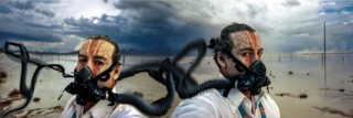 In AIR 5 the protagonist is doubled, a reference to the Hero Twins of the Navajo creation story. Two heads turned away from each other, two sets of bloodshot eyes looking out accusingly, implicating the viewer. Who will accept responsibility? The tubes of their breathing apparatus seem to curl and flap uselessly, attached, or so it appears, only to each other’s masks. There are no oxygen tanks. Are they breathing each other’s exhalations? Hair, faces, clothes and masks are covered in what we imagine to be radioactive dust. Are we looking at humans who have been rendered disposable, waste, against a liquid, leached out, contaminated landscape? Are we looking at a death sentence, planetary death in a palette of red, white and blue? They demand recognition, a witnessing, a reckoning.