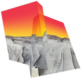 In the photograph Altered Landscape 1 (2019), the Tewa/Hopi artist Michael Namingha uses yellows and reds to make visible the methane cloud over the Navajo Nation. His Altered Landscape series consists of abstract works in which geometric shapes in neon colours are juxtaposed against black and white aerial landscapes from the Four Corners region. His compositions are mounted on shaped plexiglass and are two-dimensional but create the illusion of being three-dimensional. Namingha wants us to move around his images as we would around a piece of sculpture and to note where they appear to expand or contract.