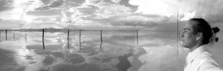 AIR 1 is an inkjet print with the proportions of a mural: the original measures almost three metres in length. This landscape seems a vast ominous expanse, eerie in atmosphere, apocalyptic in scale, segmented by a barbed-wire fence that marks the horizon. At the left side Wilson has overlaid an image of the Trinity explosion – the first ever detonation of a nuclear weapon, in New Mexico on 16 July 1945 – which rises and, in reflection on a liquid surface, descends through light on either side of the horizon. Other cloud towers and their reflections are visible to the right, forms that resemble or echo those that rose over Hiroshima and Nagasaki on 6 and 9 August 1945.