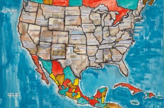 In another painting, State Names, Smith says that she ‘erased all European presence’, keeping ‘only the states that have Native American names because this whole place was ours until the invasion came’. Arbitrary colonial boundaries, boundaries that fail to acknowledge indigenous sovereignty, are obscured by running, bleeding, dripping paint. It takes work to uncover not only what is present, but what is missing or obscured. The only names that remain visible are those that originate from one of the Indigenous language groups – Wisconsin, Kentucky and Massachusetts, for example. Borders, including those between Canada, the US and Mexico, disappear under the liquid blues and greens.