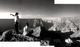 Like Smith, Wilson offers an alternative cartography. AIR 2 upsets familiar representations of the Grand Canyon, not only because the three figures are wearing breathing apparatus, but also because, as Wilson describes, they are looking over the ‘confluence of Little Colorado and Colorado Rivers … from the Navajo Nation side of Grand Canyon … a perspective that not a lot of people see, because it is remote and you have to travel through Navajo land to get there’. To Wilson this landscape is deeply familiar: this site represents home, family, a relationship to the land over multiple generations; it is close to where his family had their winter sheep camp.