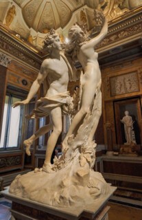 The Velázquez and the Antonello are examples of smallish misrememberings which disconcert mainly because of a perhaps sentimental expectation that you will recall great paintings more exactly than less great ones (and that their installation will remain unchanged). But my final example is weirder, and much more undermining to one who largely believes that memory of objects – rather than of people, their doings and motivations – is generally reliable. In 2002 I visited the Villa Borghese in Rome, and saw for the first time Bernini’s sculpture of Apollo and Daphne – ‘the greatest sculpture I’ve ever seen’, I wrote in my notebook, followed by ‘Eat your heart out, Canova.’ It depicts the moment when Apollo has just caught and, with his left hand, touched the fleeing Daphne, who in self-defence is turning into a laurel tree. Daphne’s mouth is open in a scream of terror, while Apollo, far from appearing a vile rapist, is portrayed as suave and dashing – in both senses. (The back story is one of malign manipulation by Cupid, who has shot Apollo with a gold-tipped arrow, which kindles love, and Daphne with a lead-tipped one, which puts love to flight.) The two life-size figures are naked, apart from a flowing robe Apollo has over one shoulder and across his loins. But Daphne is in the process of being reclothed by branches and leaves and tree trunk which will protect her from Apollo. Her fingers are turning into leaves, her toes into roots, while bark is growing around her: there is even a fierce clump of foliage protecting her from Apollo’s advancing sexual parts. It is an astounding image of the moment when fierce movement is suddenly frozen in stop-time, in turn depicted in the stop-time of a marble statue. I have seen it twice since, and each time walked around it in simple (and complicated) awe.