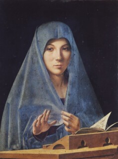 Antonello’s Virgin is shown at half-length, seated, with a reading stand in front of her. A rich blue veil covers her head and shoulders, while a deep crimson undergarment peeps through at wrist and chest. Her expression is one of otherworldly calm: she is not surprised at this moment of her destiny; though her hands tell a slightly different story. Her right hand is raised, as if to ward off the angel (not now! not yet!) while her left hand pulls protectively at her shawl. There is a theory that the first two fingers of her right hand are meant to evoke the two fingers which the Angel often points at her in recognition, so that she stands for both Virgin and Angel at the same time (which seems a theory too far to me). In front of her, Antonello has wittily given the angled wooden book-stand and the table on which it rests an attack of woodworm – which has strangely ‘spread’ to the real wooden frame of the picture itself. And there she is, resting, awaiting, by herself, the only figure in the painting. This is an exhilarating, revolutionary act by Antonello: she is staring towards us, so that we are standing where the Angel is standing; she is looking at us both as spectator and as bringer of astounding news. Are there any other Annunciations from which the Angel is missing? I know of only one other, also by Antonello, in Munich, in which the Virgin – not the same model – is slightly more perturbed by the news as she looks past our left shoulder at the arriving Angel. But it seems to be an image unique to Antonello, apart from a jocose Richard Hamilton print of a lounging naked model receiving the news on a mobile phone.