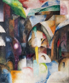 The exhibition also includes works by Sonia Delaunay, who was born Sara Stern to Jewish parents in Odesa in 1885. Orphaned at the age of five, she was sent to live with her aunt and uncle in St Petersburg and later studied art in Germany and then in Paris. She shared Exter’s interest in vivid colour (the two women met in Paris in 1911), and with her husband, Robert Delaunay, developed a technique they called Simultanism, in which contrasting colours are placed alongside each other, or allowed to overlap, creating an impression of motion and gesture. Exter’s Composition (Genoa) of 1912 is displayed next to Delaunay’s Simultaneous Contrasts (1913). Both are composed of abstract forms, but follow different chromatic patterns. In Exter’s painting, a hazy cityscape is conjured from chunks of colour that shade into one another. A soft sweep of curves in paler colours carves a space through the centre of the canvas – a street or a river perhaps – while darker curves rise towards a central arch. Delaunay’s painting is made up of cleaner geometric shapes: her marks are sharp where Exter’s are loose, and the effect of her interlocking colours is flatter but more rhythmic. In the gallery text, the curators suggest that such use of colour was influenced by local folk traditions, though no examples are given of the folk art in question.