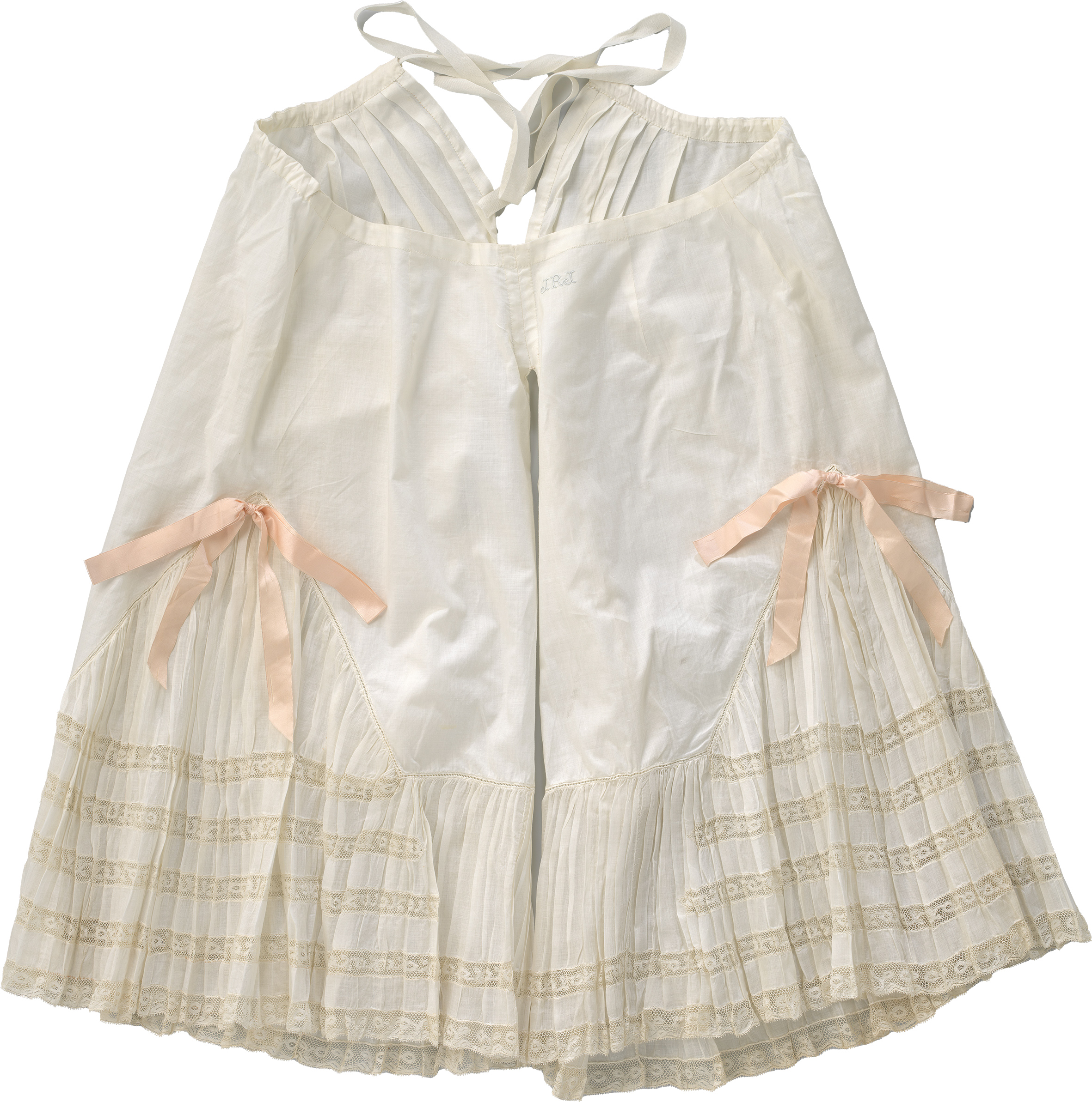 For a long time, women didn’t bother with underwear. During the 17th and early 18th centuries, it was considered unfeminine and transgressive to wear breeches or any other ‘bifurcated’ garments, which were the domain of men. (An exception seems to have been made for riding: an inventory of the clothing that Princess Anne, George II’s daughter, brought with her on a visit to Ham House in the 1730s lists six pairs of drawers along with her riding habit.) Instead, long cotton or linen chemises served as the primary underwear. Quilted petticoats and brocade skirts kept the lower half of the body warm – the thick, embroidered 18th-century underskirts in the Rijksmuseum look built to survive a Dutch winter – and the heavy fabric meant that skirts did not billow up. Menstruating women used rags held in place by knots or hooks, or bled freely. Underwear only became a problem at the end of the 18th century. Among the fashionable upper classes, the neoclassical taste for draped, Grecian dresses in pale-coloured, light fabrics (little more than elaborate nightgowns) made warm drawers underneath a necessity. The first women’s ‘pantaloons’ – versions of the breeches that Regency men wore – were nude-coloured and reached to below the knee, sometimes to the ankle; from the 1820s, they were increasingly replaced by more ‘feminine’ drawers in white cotton or linen. By the end of the 19th century, only the poorest women went without them.