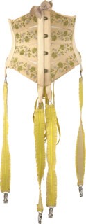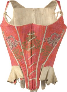 Corseting has a much longer history. One of the objects excavated at Knossos by Arthur Evans’s team was a Minoan snake goddess figurine (c.1600 BC) sporting a thick, corset-like belt around her tiny waist. An illumination in the Winchester Psalter (c.1121-61) shows Christ being tempted by the Devil in rather sexy contemporary women’s clothing: his scaly flesh is hidden beneath a skirt and long-sleeved bodice, laced up suggestively at the front. Satan’s ‘waist is most charmingly slender, and its shape admirably preserved by tight lacing from the waist upwards,’ one Victorian dress historian commented. During the early modern period, a chest-flattening corset, known as a ‘pair of bodies’, was popular among elite women (Elizabeth I’s funeral effigy in 1603 wore bodies in fustian and leather); in the 18th century, stiff, whalebone-based stays were introduced, designed to shrink the waist and elevate the bosom. The Rijksmuseum has a rigid-looking example in scarlet embroidered linen (c.1740-60), a conical structure with built-in shoulder straps and a waist circumference that looks smaller than twenty inches.