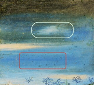 This was not a fluke. When I first started looking at the painting years ago, three things had jumped out at me that no one else seemed to have noticed. I had been puzzling over them ever since. The problem was that I didn’t know what they meant. Even standing in front of the picture itself for hours didn’t help. It’s behind glass, it’s not in great condition and it’s hard now to decipher all its intricate details with the naked eye. All I had was an intuition – until I started looking at those high-resolution scans.