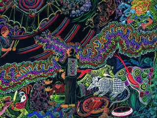 In the 1980s the anthropologist Angelika Gebhart-Sayer suggested that the kené are actually musical scores, denoting the chants sung during ayahuasca rituals. This explanation was adopted by Shipibo-Konibo traders, who hummed the chants while selling the textiles to foreign customers. Subsequent ethnographers have questioned this explanation, which appears to be a recent introduction, yet it has established itself not just among tourists and anthropologists but among the Shipibo-Konibo themselves. In his essay for the exhibition catalogue, the curator of the Paris show, David Dupuis, argues that the power of motifs such as the kené emerges from deep communal immersion in the ayahuasca state: they are keys or ciphers that ‘enchant’ by unlocking a shared experience. They are ‘devices for making us see rather than images made to be contemplated’: a matrix not for looking at, but looking through. Western psychedelic art can incorporate these motifs, but copying the pattern doesn’t copy its meanings. In contrast to Indigenous art, which binds the individual more tightly into the weave of their shared traditions, ‘globalised shamanism’ promises an escape from the dominant paradigm of materialism, in which the patterns manifested by ayahuasca are ‘hallucinations’, by definition unreal and even pathological. If the kené enchant, the aim of Western psychedelic art is to re-enchant.