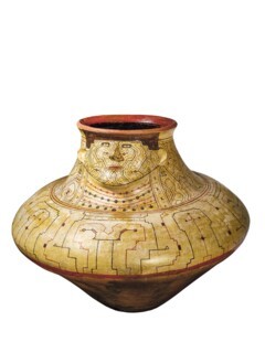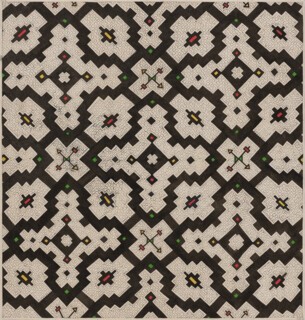 The Shipibo-Konibo people, who live along the banks of the Ucayali river in Peru, are one of several Amazonian groups whose art is intimately connected to their use of ayahuasca, a vision-inducing brew of jungle vines and leaves that contains the mind-altering compounds harmaline and dimethyltryptamine (DMT). Their textiles and ceramics are characterised by kené, geometric patterns that represent the life energy of the ayahuasca plants, which are absorbed by those who drink the brew. Kené means simply ‘design’, but the patterns themselves are far from simple, with thick lines forming complex grids that are filled by series of finer lines. To Western eyes, they resemble the maze-like etchings on an electronic chip.