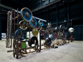 Tinguely’s 13-metre-long assemblage is usually found in the Musée d’Art et d’Histoire in Geneva. Last October, though, it was disassembled and reinstalled at the Pirelli HangarBicocca in Milan for a Tinguely show that gathered forty of his kinetic sculptures and other fantastic constructions. A large number were shipped from the Museum Tinguely in Basel, donations from Saint Phalle; others from private collections. The advantage of seeing them all arranged in a 5000 square metre factory space is that together the machines become elements of a larger machine: one sculpture is set in motion for its three-minute burst of activity, then comes to rest, before the next one starts thumping and turning. It’s a vast choreography of sound and movement. The pieces speak to one another, sometimes purposefully, as in the case of the ‘Philosophers’ series (1988-89).