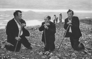 Koudelka, he writes, was ‘an in-between person, having fled from Prague after the Russian invasion of 1968 and then taken up a relentlessly peripatetic professional life as a photographer’. The men in the photograph are not named: that would be to ruin the whole show, allowing for the possibility that they went home afterwards and did something other than kneel and pray in grim weather. ‘Just as the people in the photograph are caught in a precise moment of time,’ Joyce writes, ‘they are also outside time.’ But of course they aren’t outside time: they just look like they are. Joyce begins by identifying them simply as men from the west of Ireland who work the land. He then reveals their names: ‘The younger man on the right is my first cousin Seán Joyce … the man on the left Paddy Kenny, the husband of Seán’s sister … The third man, in the middle, is a neighbour of Paddy’s, Máirtín Maingín … All three men have now died … Carrying their mark – the height of my kin, their black hair – I share these bodies, our genes, a collective deep history.’