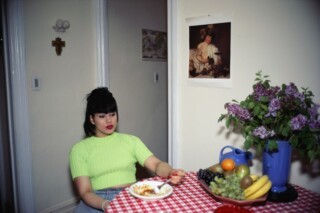 ‘I guess if you photograph someone enough,’ Goldin told an interviewer, ‘they achieve a kind of star magnitude. They become a star in the movie of my life.’ Her aspiration for The Other Side ‘was to put the queens on the cover of Vogue’. Here portraits of ‘gender euphoria’ stretch across three decades, and around the world, from New York to Manila, Berlin to Bangkok. The focus is on the detail – the rhinestones, the mink, the wigs. Her subjects are participating in the creation of their own images, whether it’s Colette Modelling in the Beauty Parade, C Performing as Madonna or Misty and Jimmy Paulette in a Taxi, NYC (which echoes the shot of the aristocrats in their carriage in Visconti’s The Leopard). These are faces that want to be seen. Caravaggio’s Bacchus is tacked to the wall behind a portrait of a woman staring into a bowl of grapes. Her body language echoes that of the god looking over her; her expression is a version of Bacchus’s but not quite a repetition. Goldin’s art-historical (and pop-cultural) doubles appear like guests from a different time.