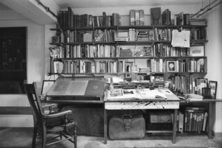 She wanted to create something that honoured Gray’s quirky personality and practice. And so, when you enter the archive, you find yourself in a living room dotted with motley furniture. To your left there’s the two-legged desk Gray found in a back lane and had drilled into the wall for stability. To your right there’s a table overflowing with paint pots and palettes and brushes and spray mount. On the wall, an octagonal tabletop has been transformed into a luminous artwork. And in the centre of the room there’s the green chair on which many models sat in thrall to its owner’s monologues, and which appears – as a throne – in his mural of the Book of Ruth in an East Renfrewshire church. On the two-legged desk is a photograph of a young Alasdair – Billy Bunter in a beret – with his sister, Mora; a chicken bone, inscribed with the date of the chicken’s consumption; a handful of pens in an old prunes can; and a selection of his books. There is a fuller library, laid out exactly as it was in his flat, in the room next door.