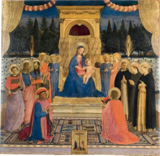 Fra Angelico was born Guido di Pietro around 1395 in a hamlet in the Mugello, a region thirty kilometres north-east of Florence. By 1417 he was in Florence itself and already working as a dipintore, according to a document recording his admission to one of the city’s lay confraternities. Around 1420, he entered the Dominican Order, soon after taking the name Giovanni, and completed his year-long novitiate at the convent of San Domenico in Cortona, Arezzo. Once he became a friar, Angelico’s career as a painter took off: he received a steady stream of commissions both from within the order and beyond it. One advantage of his dual calling was that he could work without having to follow the rules or pay the fees of the painters’ guild. For the next fifteen or so years, based at the friary in Fiesole, he produced altarpieces, reliquaries and illuminated manuscripts for church communities and individual patrons, primarily in Tuscany.