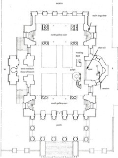 On the whole the Commissioners followed the architects’ suggestions. They specified free-standing churches within churchyards; porticos at the west end; a parish room and vestries; and towers with spires. They also set out liturgical requirements: a true east orientation, a raised altar approached by three steps, a font large enough to allow infant baptism by dipping, and low pews – ‘single and of equal height so that every person in them may be seen either kneeling or standing’.