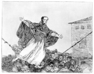 If Goya actually believed that women rode broomsticks, he was at one with the most reactionary elements in the Catholic Church, forces he appears to have detested. Hughes wonders whether these witchcraft prints were a disguised attack on the Church, and notes the parallel between the rites of the witches and those of the priesthood. What is certainly true is that placing scenes of grotesque deceit, erotic initiation and ritual cruelty on the part of witches next to analogous practices sanctioned or indulged by respectable society helps to point up the irrational basis of the latter. Altogether the most remarkable quality of Los Caprichos is the way a cynical, demotic commentary accompanies an ostensibly Enlightenment project – the exploration of cruel social conventions and popular superstition – making it hard to reconcile with the optimistic agenda of reforming intellectuals such as Gaspar de Jovellanos, although Goya may have felt close to him, and painted him with evident sympathy.
