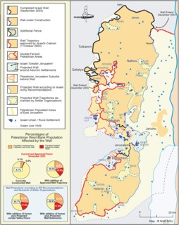 Qalqilya has a population of about 60,000 and is itself a major agricultural town, surrounded by fields, orchards, greenhouses and olive groves. Like other large Palestinian towns, it used to serve as a commercial and administrative centre for the towns and villages around it, whose combined population is another forty or fifty thousand. Because Qalqilya also lies beside the so-called Green Line that is supposed to separate the West Bank from Israel – a nominal border which is being made almost meaningless by the construction of the separation barrier, 90 per cent of which runs east of the Green Line, deep into the West Bank – it used to be possible for Palestinians from neighbouring towns inside Israel to go to the market there or meet friends and relatives. Israel’s separation barrier has destroyed a complex of historic, commercial, agricultural, social, cultural and familial relationships. Despite the talk of this being a ‘security fence’, it is obvious that the real aim of the barrier is to absorb as much land, and as few Palestinians, as possible, to acquire pockets of territory that can easily be connected – and are already de facto annexed – to Israel. Nowhere is this clearer than in the well-watered and fertile agricultural region around Qalqilya. North of the city, the barrier absorbs about 6000 acres of rich farmland. Qalqilya is now the westernmost tip of a territorial peninsula created by the barrier.