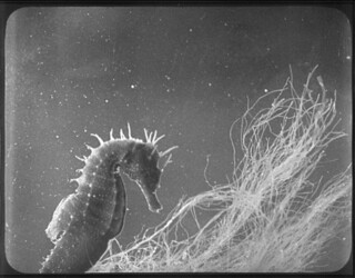 His scientific and artistic ambitions are most involuted in L’Hippocampe (The Seahorse), filmed in 1934 in the bay of Arcachon and in Painlevé’s studio. Everything about the seahorse and its milieu is a reminder of something else – the creature’s real medium is metaphor. (Painlevé even gives us seahorses swimming in front of footage of a horse race.) According to the director’s own amused voiceover, a young seahorse resembles a King Charles spaniel. Fully grown, it’s a puffed-up and pompous individual, fretfully anthropoid, given to pouting and anxiously darting its eyes. Like the sea snail, this animal is ambiguously sexed: the female inserts her eggs in the male’s belly, and he squirts out their offspring in gassy contractions. The young attach themselves to a forest of artfully placed weeds: a green world underwater that looks in certain shots like the mise-en-scène of Max Reinhardt’s A Midsummer Night’s Dream, released the following year.
