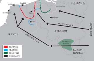 The Allies believed that in defending the River Dyle they were protecting western Belgium from the main thrust of the German advance, which they saw as a repetition of Germany’s invasion of Belgium in the early days of the First World War. This was exactly what Hitler meant them to think. In fact, the westerly advance of the Nazi troops was conducted by Army Group B (26 infantry and three armoured divisions), while the much larger Army Group A (38 infantry and seven armoured divisions) was secretly heading south into France through the Ardennes.