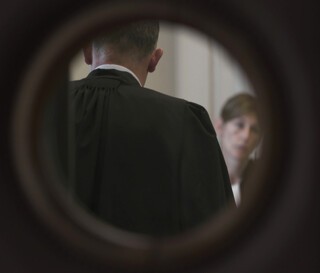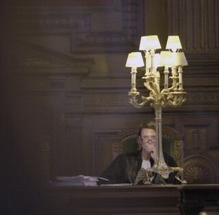 The courtrooms of the Palais de Justice have heavy doors padded with leather and inset with round windows, and it’s through these that much of Young’s video was secretly shot. She concentrates at first on the faces and gestures of the judges – they shuffle their papers, pause with pen in midair, peer over their reading glasses at the advocates in front of them, cock their heads quizzically or stare straight ahead with what looks like unfathomable boredom but is probably strategic impassivity. They are all silent. Stuck on the other side of soundproof doors, Young gives Palais de Justice a soundtrack drawn from the muffled life of the corridor, which occasionally we see reflected in the scratched pane of a courtroom porthole.