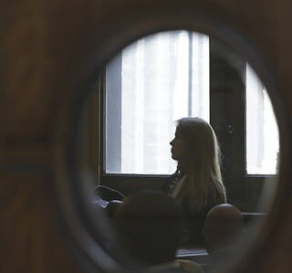 It’s the gaze, most obviously, of some cinematic precursors. All those backs of heads, with hair pinned up or loosely pulled to one side of the neck, resemble certain indelible shots in Andrei Tarkovsky’s Solaris, Chris Marker’s La Jetée and its ur-text, Hitchcock’s Vertigo. There’s a sci-fi quality to Palais de Justice: from the submarine portholes to the growing sense that the work shows a future in which women have taken over the institutions of justice, and perhaps much else (assuming, that is, anything exists outside of this huge self-involved system). The men who appear in Young’s video seem at best peripheral figures, always subject to the speech and gaze of the judges, or stranded in passageways and vestibules. One fretful advocate looks as though he has been waiting there for ever.